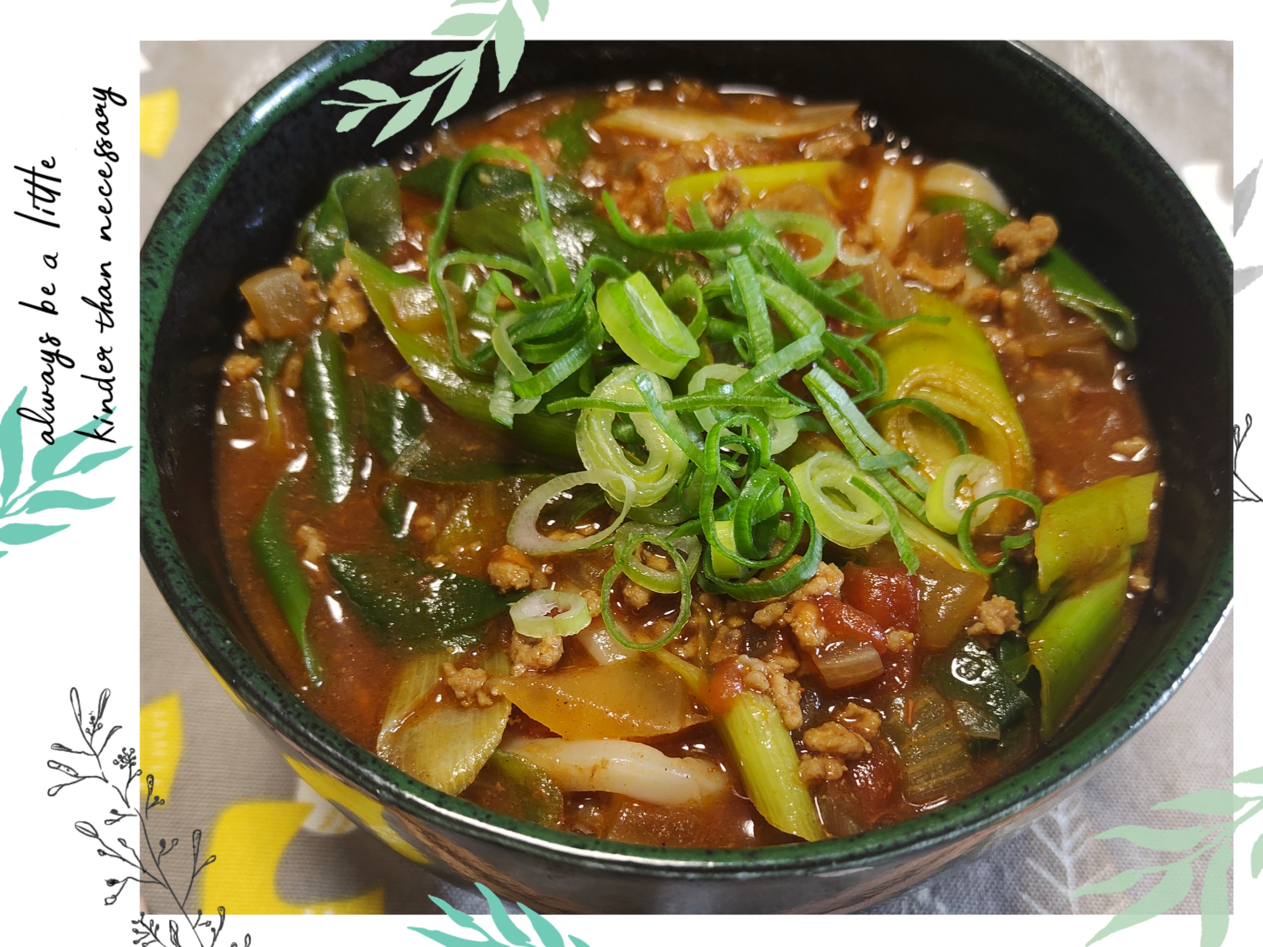 1. 鍋に、のこったカレー、ねぎ(斜め切り)、めんつゆ(大さじ2)、水(100ml)をすべて入れ、火にかける。