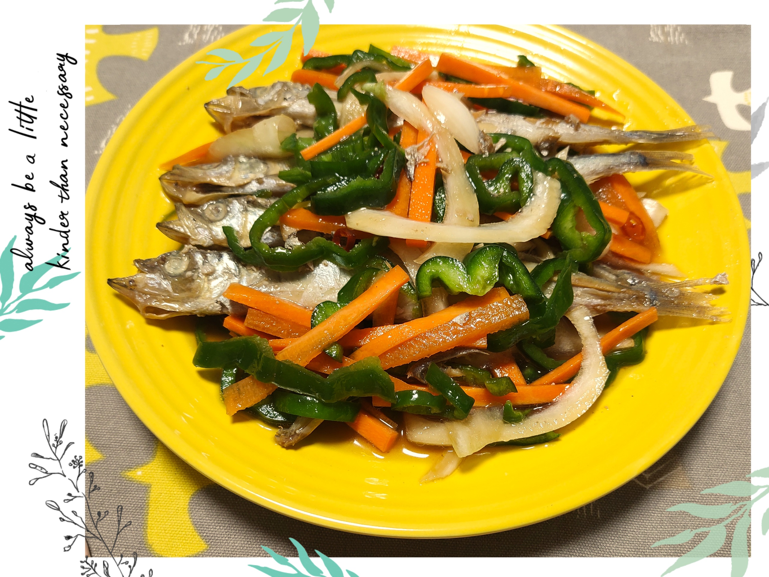 - 玉ねぎ、にんじん、ピーマンを千切りにし、蓋のできる容器に入れ、鷹の爪を振りかける。