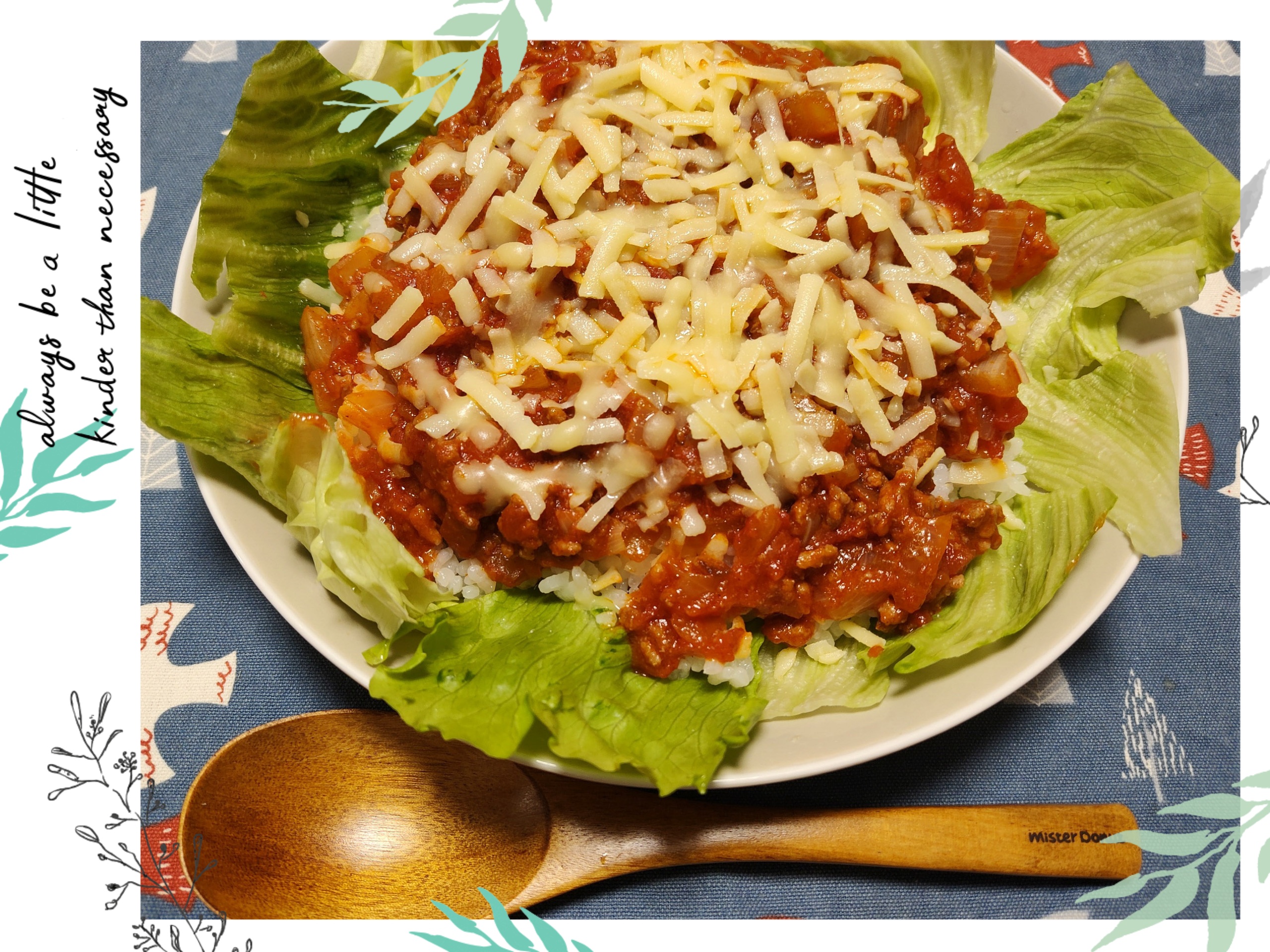 - レタスを水洗いし、食べやすい大きさに千切る。ご飯と共に皿に盛り付ける。